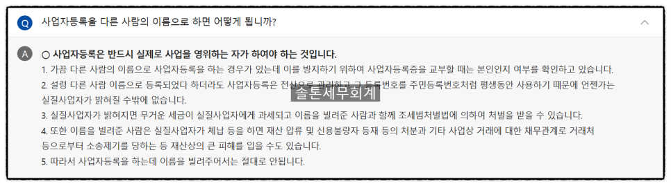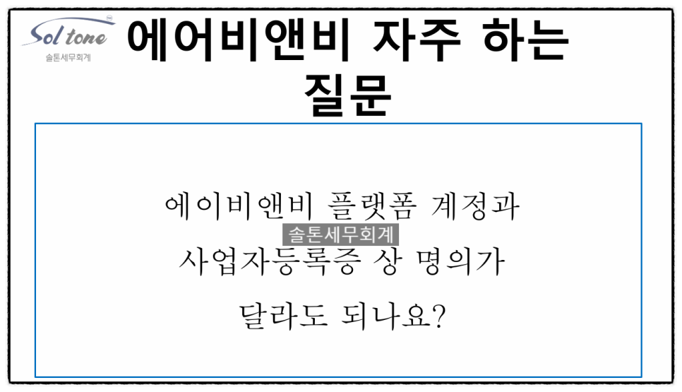 다른 사람 명의로 사업자등록을 냈다면 명의 위반으로 최악의 경우 조세범처벌법에 의하여 처벌까지 받을 수 있습니다. 그런데 유독 에어비앤비, 공유숙박업과 관련된 상담에는 위와 같은 질문을 많이 받습니다. 왜 그럴까요? 에어비앤비, 공유숙박업은 신종업종으로 공유숙박업을 시작하기 전에 관련 법을 검토하여 영업허가증을 받고 사업자등록증을 받고 플랫폼에 등록하고 사업을 시작하는 원칙적인 과정이 많이 생략된 업종입니다 원칙적인 과정으로 공유숙박업을 시작해야 한다는 인식 (그에 따른 세금신고 납부는 당연) 보다는 적발되면 세금을 납부한다는 인식이 더 만연하고 그러다 보니 적발되지 않을 과정으로 공유숙박업을 시작해야 한다 라는 인식이 보편적인 업종인것 같습니다 최근 공유숙박업과 관련된 세금 고지, 해명 안내문은 에어비앤비 플랫폼의 자료를 기반으로 시작됩니다 그리고 에어비앤비 플랫폼 계정 주인과 피치 못할 사정으로 영업허가증, 사업자등록증 상 대표가 일치하지 않는 경우가 많습니다 이럴 경우 원칙적인 과정을 안내하자니 지금 과세관청의 추세인 세금 고지, 해명 안내문 대상에 포함될 수 있습니다 그렇다고 해명 안내문 대상에 벗어나는 변칙적인 과정을 안내하자니 원칙적인 과정을 지키지 않아 페널티 대상이 될 수 있습니다 에어비앤비플랫폼 계정과 사업자등록증 상 명의가 달라도 되나요 라는 질문은 쉬우면서도 답변하기 난감한 질문 같습니다^^ 솔톤세무회계는 세무사가 직접 상담합니다. 더 궁금하신 사항 있으면 솔톤세무회계로 연락 주세요. 상담 시 소정의 수수료가 발생합니다. 해당 글은 작성일 기준의 법령과 예규를 준용하였습니다. 감사합니다.