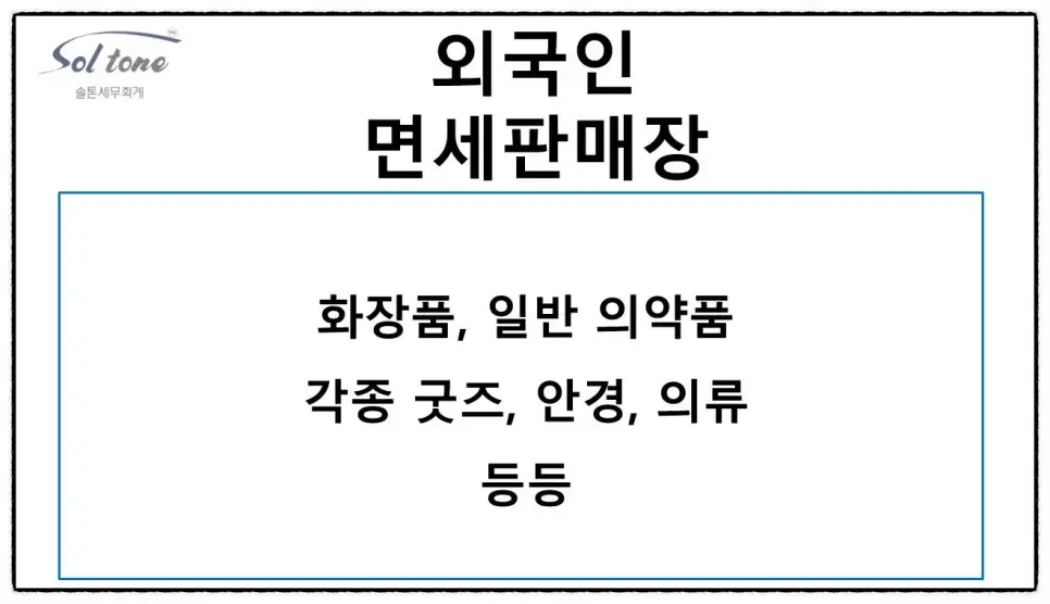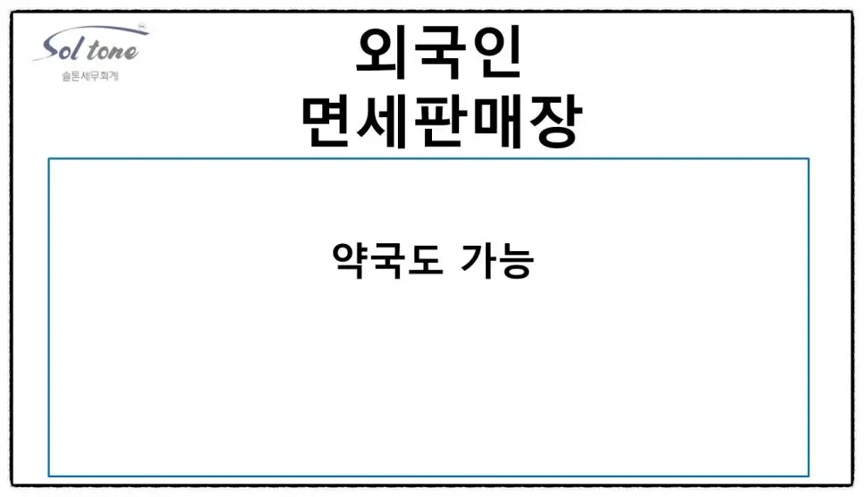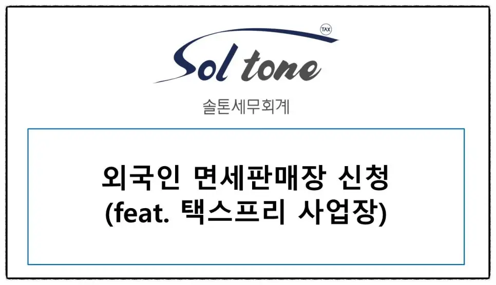 외국인 손님 그냥 보내지 마세요~ 외국인 손님 놓치지 마세요~ 면세판매장 신청 어렵지 않습니다 홈택스에서 할 수 있으며 세무서 방문에서도 할 수 있습니다 다만 간이사업자는 안되며 체납이 있어도 안 됩니다 또한 환급창구운영사업자라고 대행사 VAN이 있기 때문에 실무도 어렵지 않습니다 이렇게 외국인 관광객 면세판매장에서 외국인에게 판매한 물건은 영세율로 부가세가 과세되지 않습니다. (면세판매장이라고 면세 적용이 아닙니다^^) 다만 부가세 신고 기한 내에 서류를 제출하셔야 합니다. 소매업의 택스리펀드, 택스프리 : 외국인이 정가로 산 물건의 부가세 혹은 개별소비세를 우리나라에서 출국 시 돌려주는 제도로 사후면제점이라고도 한다. 사후면세로 진행하면 외국인이 출국하지 않았을 때의 위험도도 줄일 수 있죠. 상담 후 의뢰인들이 대부분 하시는 말씀이 있습니다. 그냥 진작에 상담받을 걸 그랬어요 이런저런 정보에 불안했었는데 막상 상담받아보니 내 상황은 그런 게 아니었더라 문제가 있는 상황이라도 이렇게 해결하면 되는구나 라고 명쾌한 답을 알고 가기 때문에 상담 잘 받았다고 이야기하십니다. 세금과 관련된 의문, 문제, 불안하다면 상담받아보시는 걸 추천드립니다! 솔톤세무회계는 세무사가 직접 상담합니다. 더 궁금하신 사항 있으면 솔톤세무회계로 연락 주세요. 해당 글과 관련된 서비스는 수수료가 발생합니다. 해당 글은 작성일 기준의 법령과 예규를 준용하였습니다. 감사합니다.
