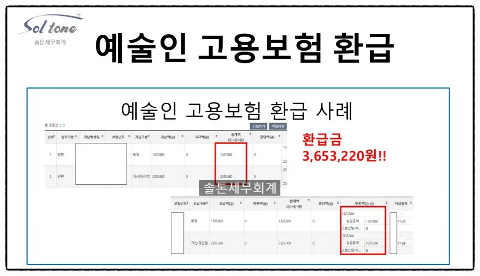 솔톤세무회계에서는 업무상 까다로운 예술인 고용보험 신고 대리를 진행합니다. 사업장에서 3.3% 예술인과 계약을 하면 그전에는 사업소득, 인건비 신고만 진행하면 됐습니다. 하지만 이제는 예술인 고용보험 가입, 신고가 필수죠. 솔톤세무회계는 3.3% 예술인에 대해서 고용보험 신고도 하고 원천세 신고, (간이) 지급명세서 제출 업무까지 진행합니다. 단기 예술인은 매달 신고 일반 예술인은 취득, 상실 신고가 필수라는 점 그리고 보수총액 신고도 해야 하는 점 이 세 가지는 꼭 기억하셔야 합니다. 솔톤세무회계에 예술인 사업장 대표님이 방문해 주셨구요 (예술 업계 소개로 방문해 주셨어요^^ 감사합니당) 저희가 해당 사업장을 쭉 살펴보니 예술인 고용보험 관련해서 놓친 게 보이더라구요. 그래서 제가 고용보험료 300만 원 환급!! 돌려드렸습니다.